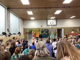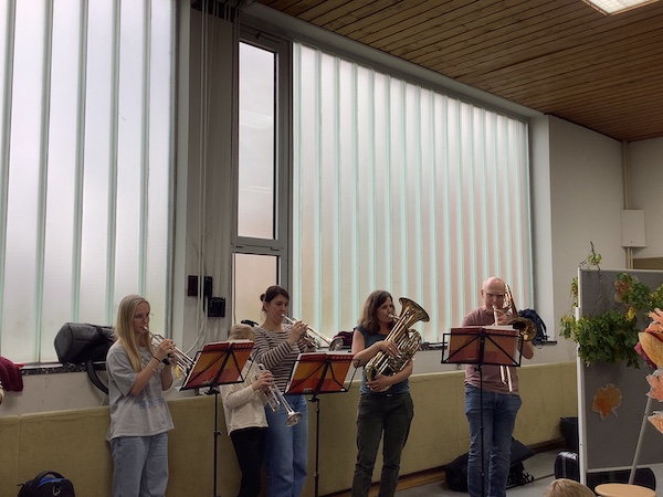 Mit fröhlicher Musik wurde der Erntedankgottesdienst nach dem Segen beendet und alle Kinder und Erwachsene gingen wieder beschwingt in ihre Klasse.